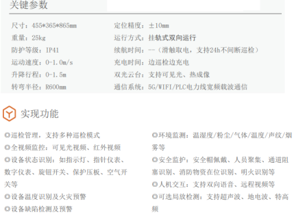 SPD-TWE是专为无人值守配电室打造的轨道巡检机器人,可替代人工巡逻检查、一站式人工巡检效率低下、检测质量分散、手段单一等难题。TWE室内轨道巡检机器人的优势在于可以自动完成各类设备的运行状况巡检,巡检过程无需人工参与,不受环境危险恶劣因素影响。机器人主要搭配可见光摄像头、红外热成像摄像头、声音传感器、温湿度检测设备、粉尘颗粒浓度采集、气 体传感器、烟雾传感器、雷达避障传感器等。